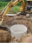 Drywells are plastic or concrete perforated tanks for discharging effluent into large, fabric covered, gravel-filled holes: Leach Pits. Drywells are a passive (no pump) solution for small/odd lots where a long leach field is not possible or desired. Pits take advantage of surface area around sides to dispose of large amounts of water in the right soil and capability to accept large surges at one time. |