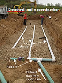 Pressurized Systems![]() Pressurized Systems make use of an electric pump to force effluent into mounds, trenches, beds or chambers. Even distribution of effluent is key to smaller drain field sizing and better treatment of the waste water. Poor soil percolation sites (high water table) often require pressure distribution sand mounds with two inch diameter pipe drilled with 1/4 inch holes every two feet, or so. Drip systems utilize small nozzles for even more uniform distribution of waste water. |