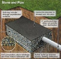 Stone Trenches![]() Stone Trenches are a system consisting of four inch pipes installed horizontally in 3' wide trenches. Typically an alternator valve divides the system of trenches in half. The pipes are installed on 6" to 24" of 6A stone as specified on the permit. The pipes are perforated to allow the effluent to drain on the stones and surrounding soil. More stone is placed around and onto the pipes, followed by a layer of filter fabric, than 6' to 24" of soil cover. Specific requirements vary with each permit. |